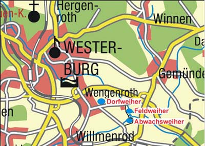 Dorfweiher, Feldweiher und Abwachsweiher befinden sich im Westerburger Stadtteil Wengenroth und sind mit dem PKW zu erreichen. An allen drei Weihern sind auch behindertengerechte Angelplätze, die auch mit dem Rollstuhl zu erreichen sind.